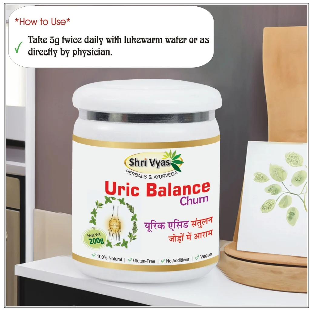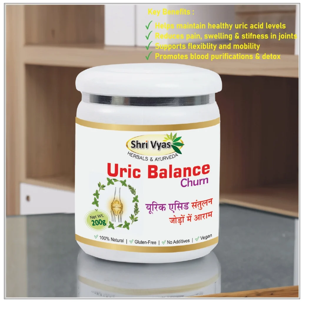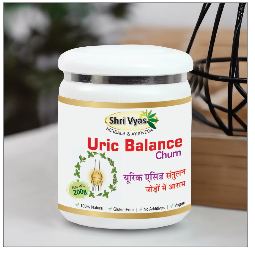 Maintain daily wellness with Shri Vyas Uric Balance Churn, an Ayurvedic herbal formulation developed to support healthy uric acid balance and joint comfort.