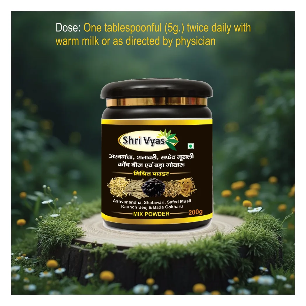 Elevate your health journey with the Shri Vyas Mix Powder, a comprehensive 500g Ayurvedic blend meticulously combining five of the most celebrated rejuvenating herbs (Rasayanas). This powder is formulated to address general weakness, boost immunity, and enhance physical and mental vitality, making it an essential addition to your daily regimen.