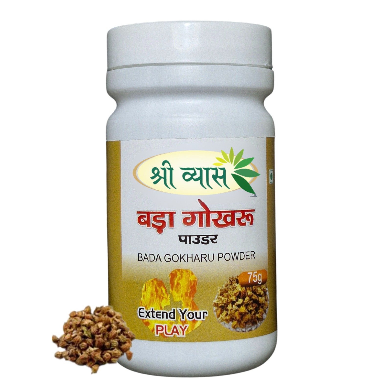 Shri Vyas Bada Gokharu Powder (also known as Gokshura or Bada Gokshura) is a time-tested 75g Ayurvedic supplement revered for its dual benefits: enhancing male vitality and providing robust support for the urinary system. This powder is a natural choice for men seeking to boost their stamina, strength, and overall performance, as suggested by the label’s focus on longevity and vigor.