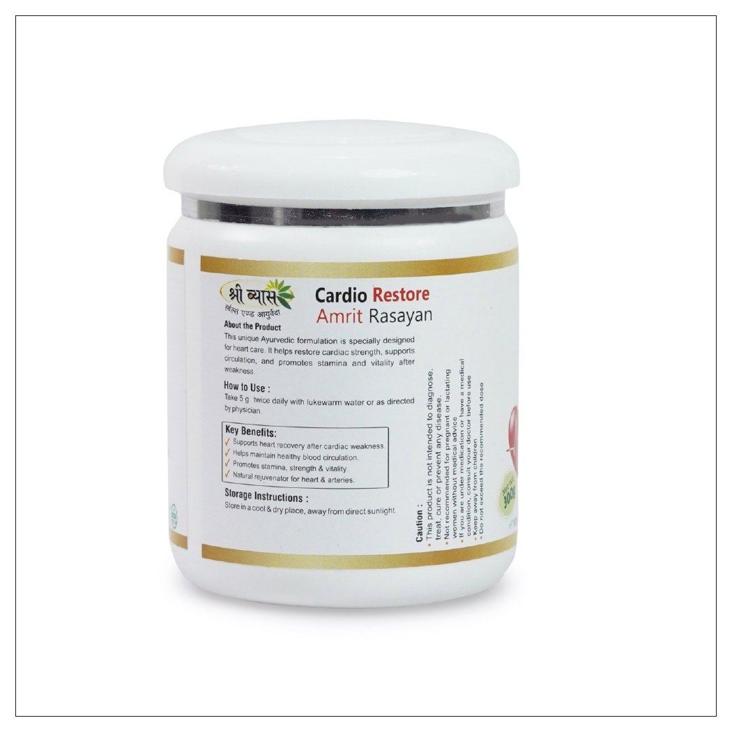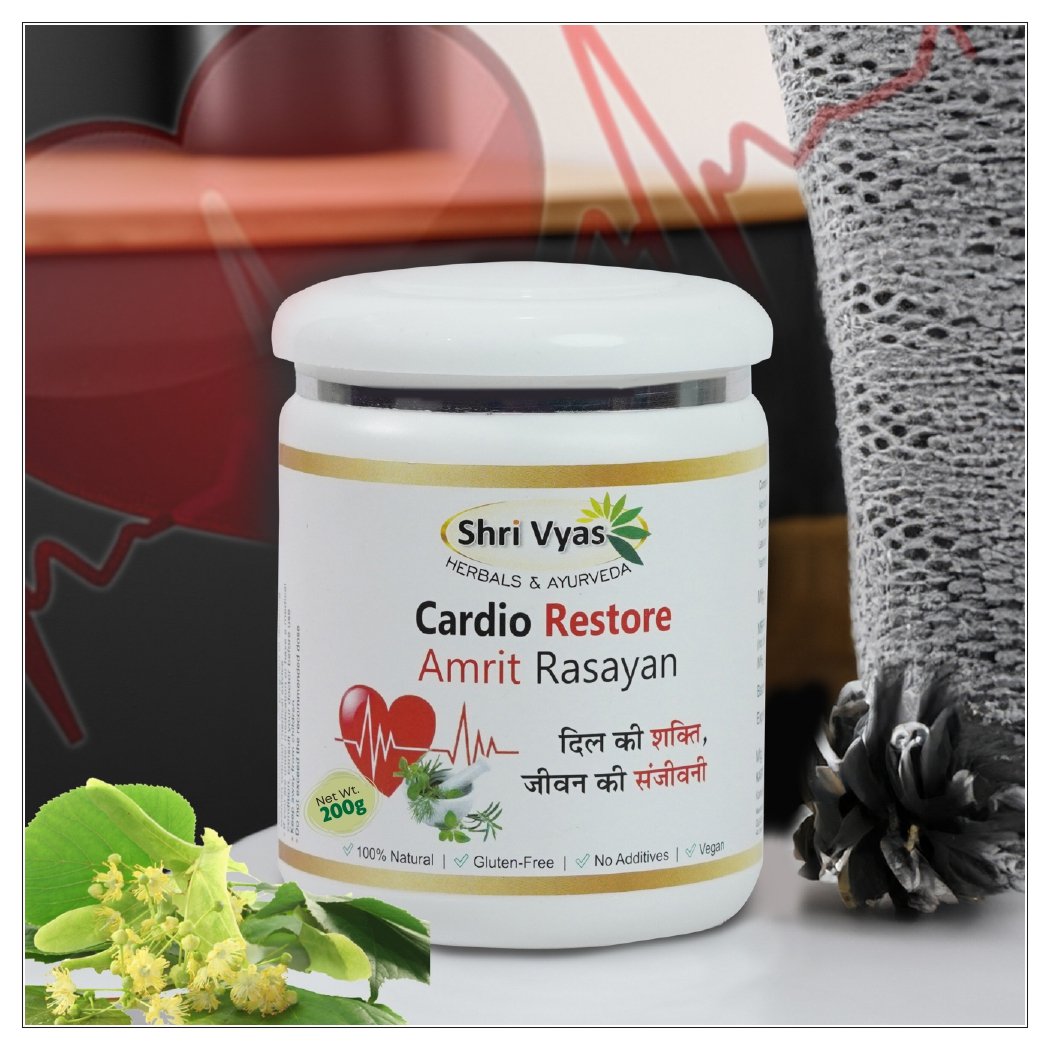 Shri Vyas Cardio Restore Amrit Rasayan is a powerful Ayurvedic cardiac tonic designed to support overall heart health and enhance cardiovascular strength. Made using time-tested Ayurvedic herbs, this natural formulation helps maintain healthy cholesterol levels, supports smooth blood circulation, and promotes daily cardio support for a healthy, active lifestyle.