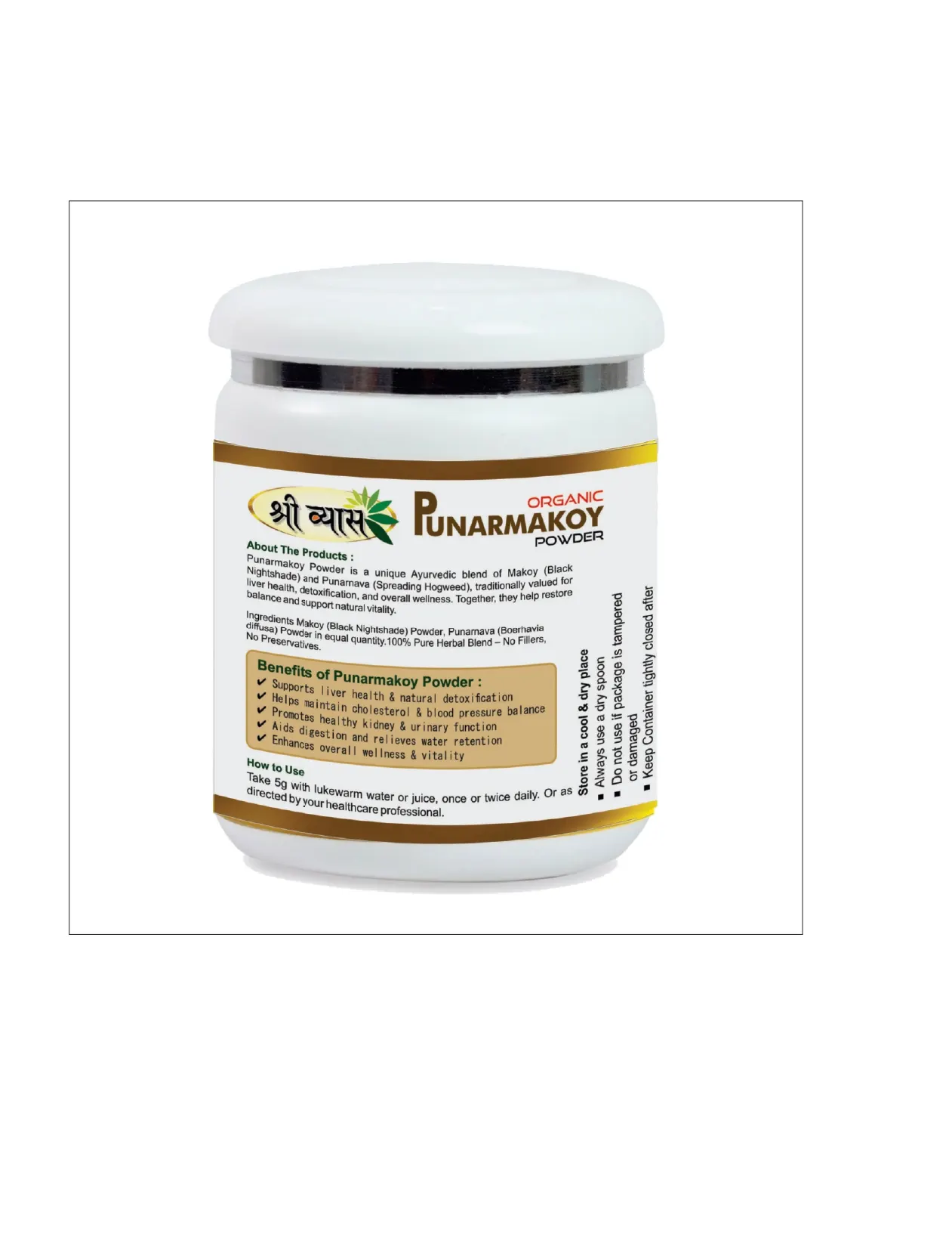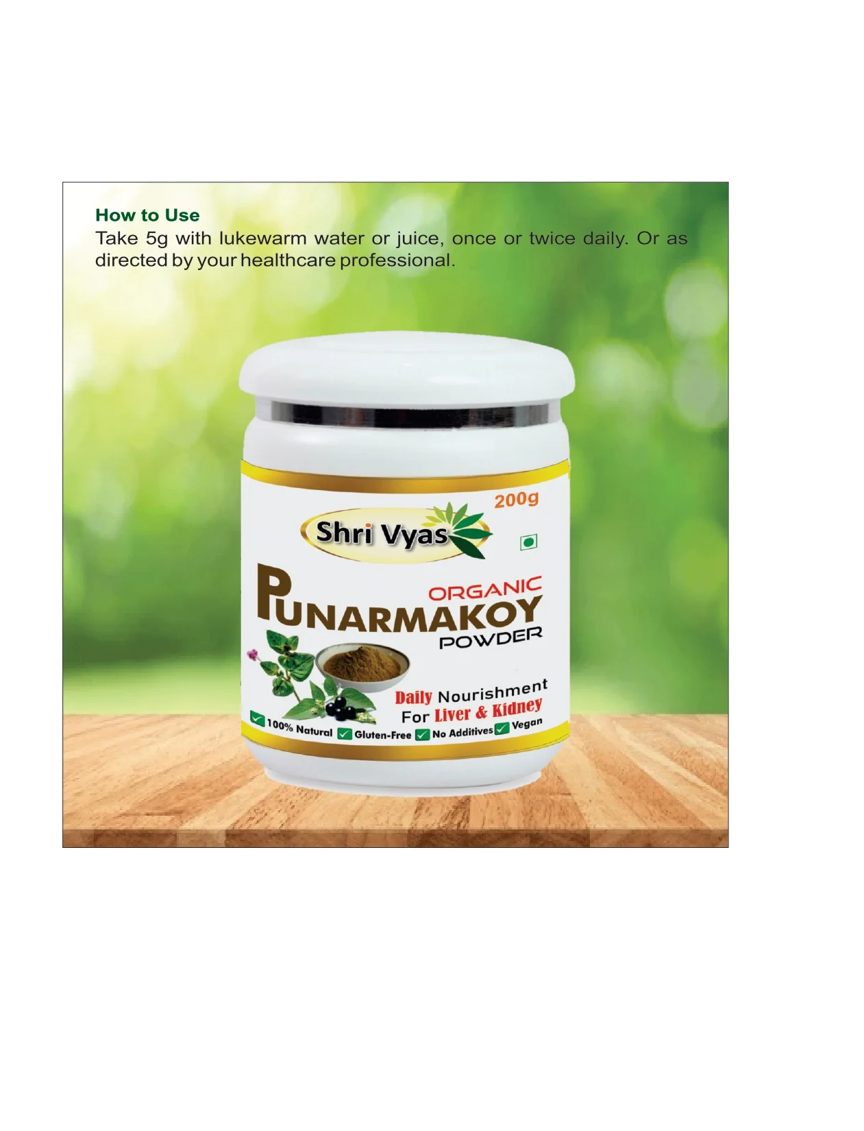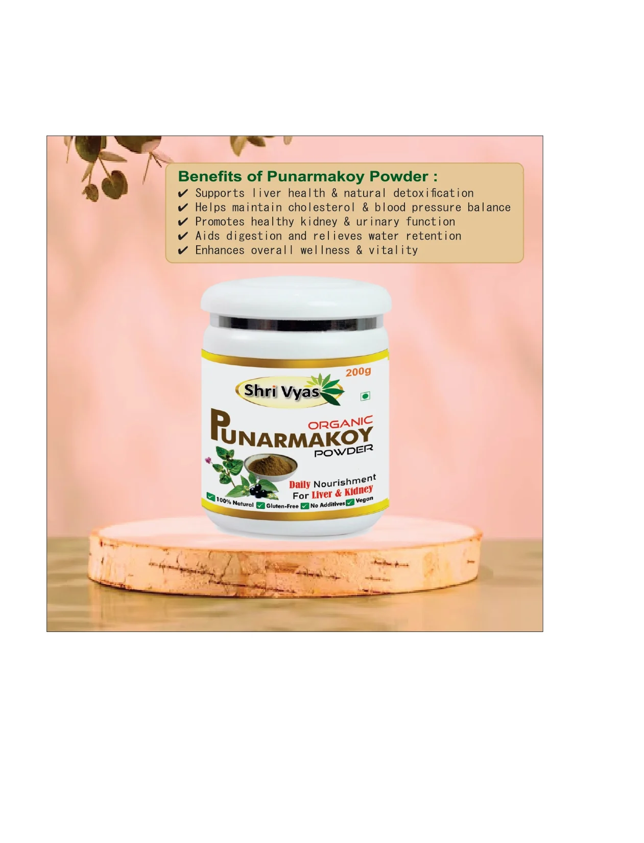 Shri Vyas Organic Punarnavakoy Powder is a natural Ayurvedic herbal powder traditionally used to support daily nourishment and overall wellness. 100% natural, vegan, and free from additives, it fits easily into a balanced lifestyle.