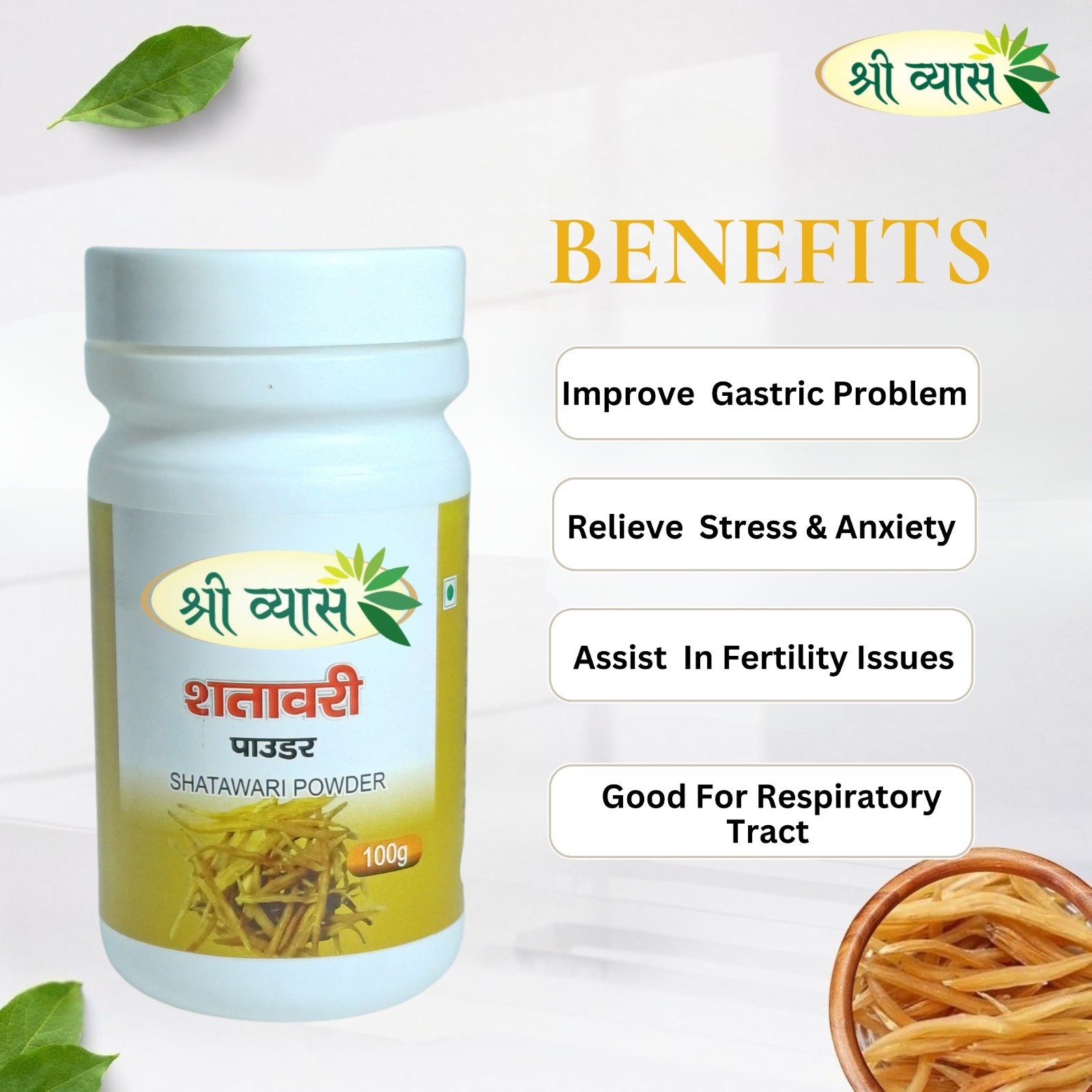 Often translated as “she who possesses a hundred husbands,” Shri Vyas Shatavari Powder is the foremost Ayurvedic herb recommended for female wellness. This 100 g pure powder provides a natural, holistic approach to supporting the female reproductive system, from menstrual cycles and fertility to menopause.
