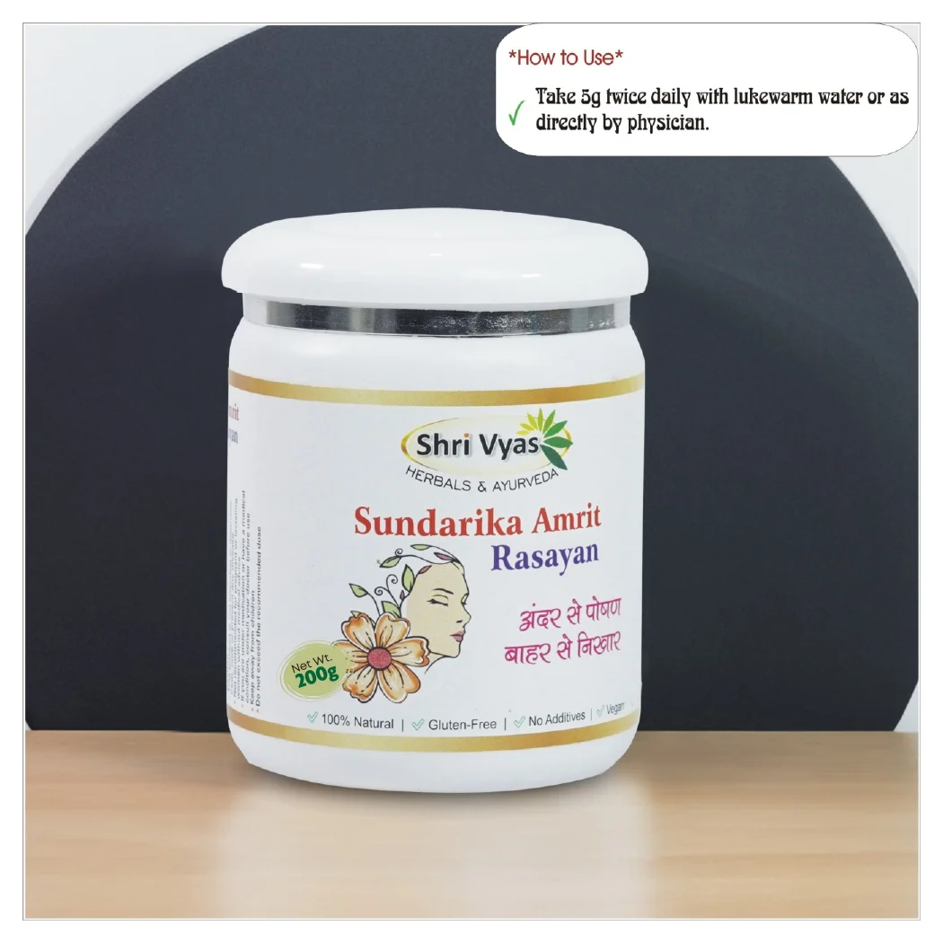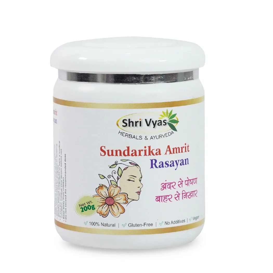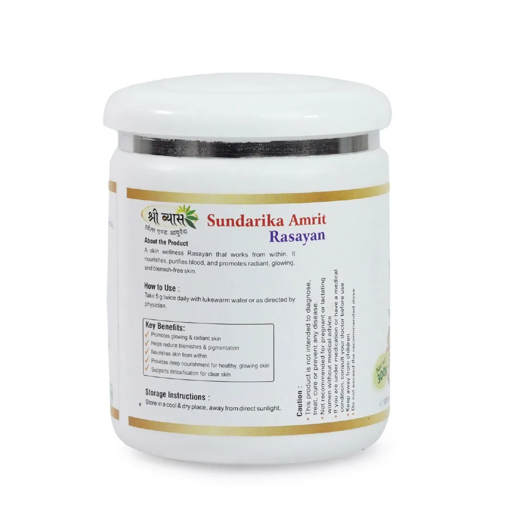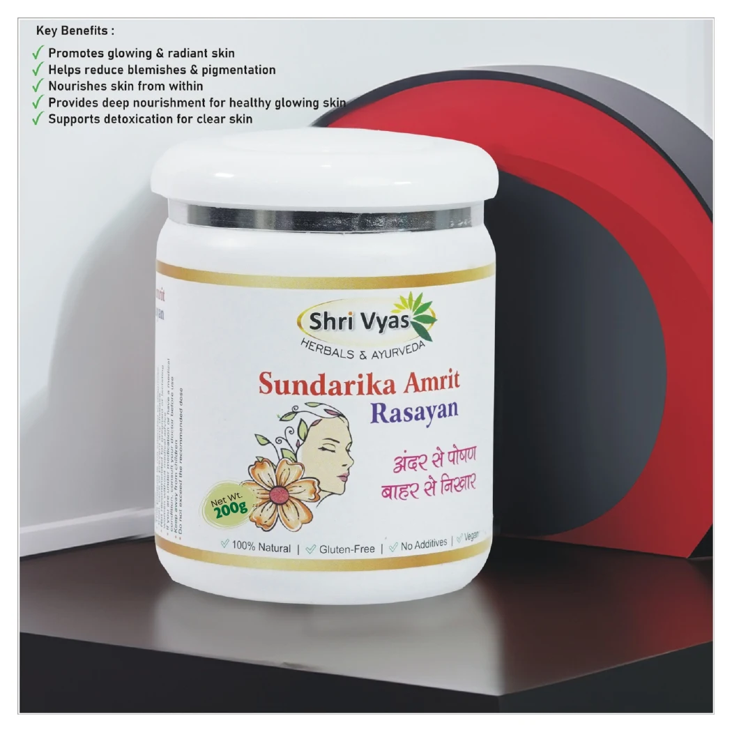 Shri Vyas Sundarika Amrit Rasayan is a premium Ayurvedic formulation designed to enhance skin beauty and promote overall rejuvenation. Enriched with powerful herbal ingredients, this Rasayan works from the inside out to give your skin a natural glow while supporting internal balance.